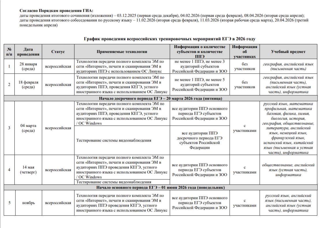 Утверждён график проведения всероссийских тренировочных мероприятий ЕГЭ в 2026 году. В соответствии с ним в 2026 году будут проведены всероссийские тренировочные мероприятия по подготовке к проведению единого государственного экзамена. Мероприятия организуются с использованием технологий передачи полного комплекта экзаменационных материалов по сети «Интернет», печати и сканирования экзаменационных материалов в аудиториях пунктов проведения экзаменов, а также с применением программного обеспечения на базе операционных систем Linux и Windows.